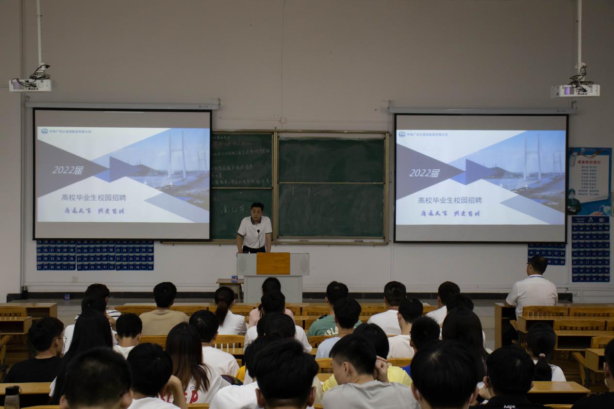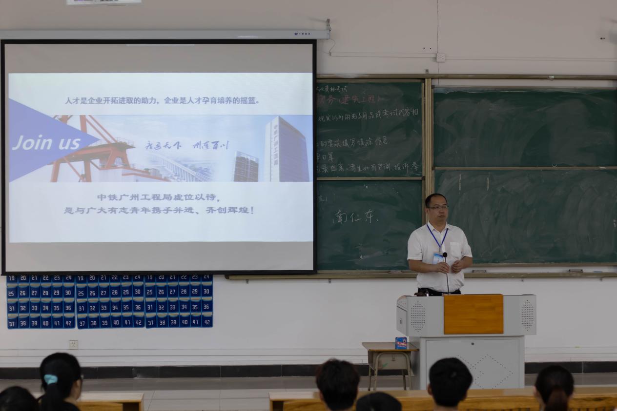 中铁广州工程局集团第二有限公司是一家集工程施工、设计、科研、投资和海湾工程于一体的综合性大型建筑公司,其岗位需求和土木工程与管理公司的工程管理、道路桥梁与渡河工程、港口航道与海岸工程、土木工程等专业培养方向高度契合。因此,毕业班同学的应聘兴趣较高。本次招聘分为观看企业宣传片,中铁广州局二局领导进行宣讲,现场提交简历、现场进行面试,签约4个环节进行。