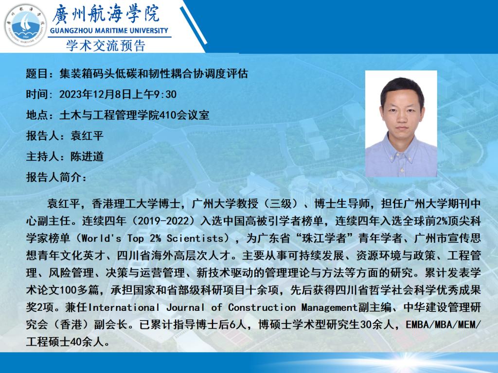 红山土木博士论坛第8期预告——袁红平博士《集装箱码头低碳和韧性耦合协调度评估》