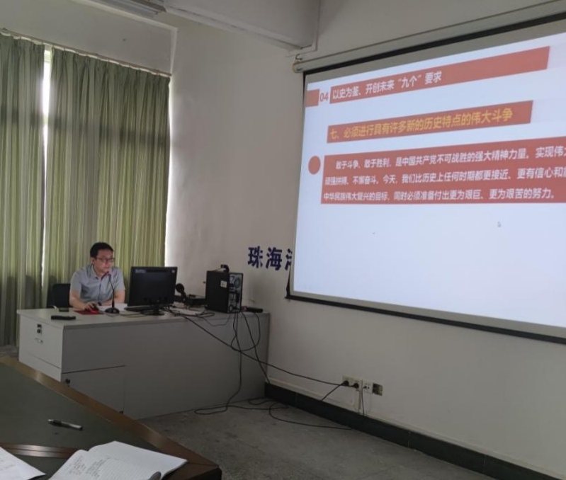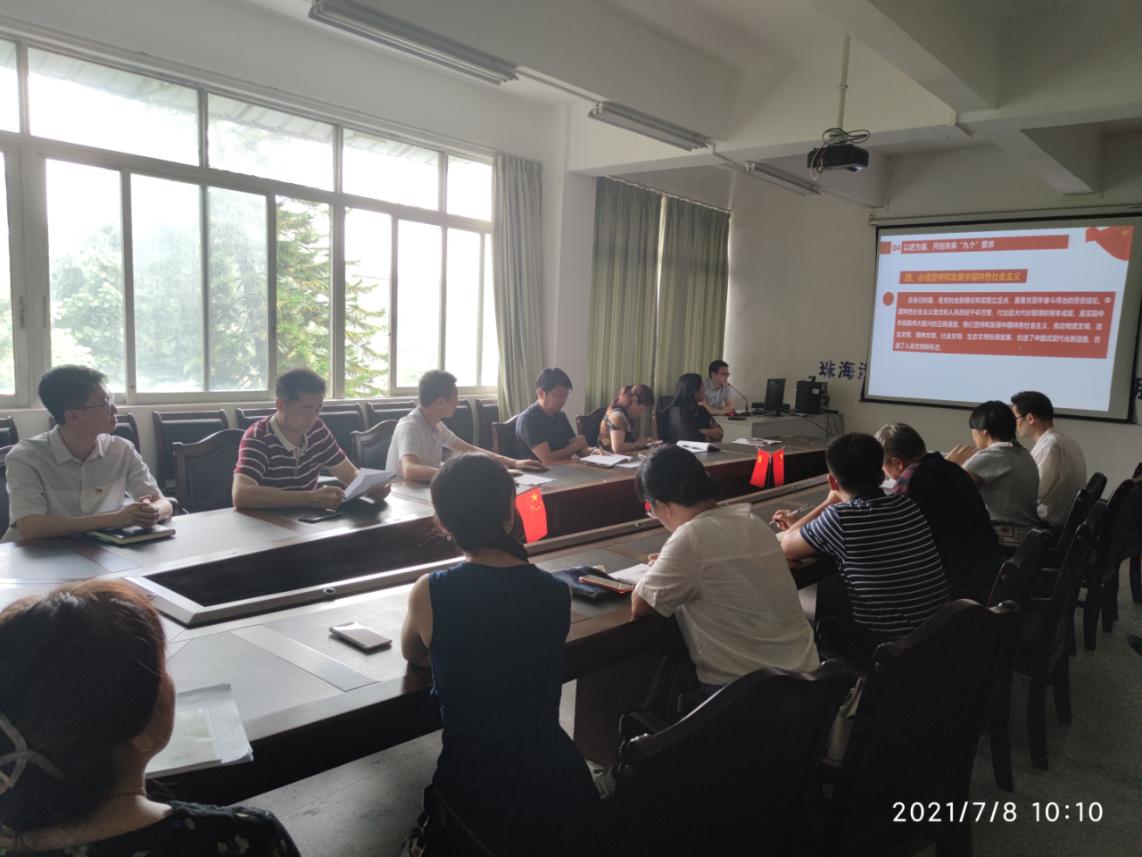教工党支部书记给支部的各位党员同志开展题为“解读庆祝中国共产党成立一百周年大会习近平总书记“七一”重要讲话精神”的党课学习活动。2021年7月1日上午8时,庆祝中国共产党成立100周年大会在北京天安门广场举行,习近平总书记发表重要讲话。主要内容包括以下七个方面:(1)我们实现了第一个百年奋斗目标,全面建成了小康社会;(2)为中华民族伟大复兴,中国共产党创造了“四个伟大”成就;(3)弘扬光荣传统、赓续红色血脉,继承伟大建党精神;(4)以史为鉴,开创未来“九个”要求;(5)全面准确贯彻“一国两制”方针;(6)新时代的中国青年要以实现中华民族伟大复兴为己任;(7)全体党员要继续为实现人民对美好生活的向往不懈努力。
