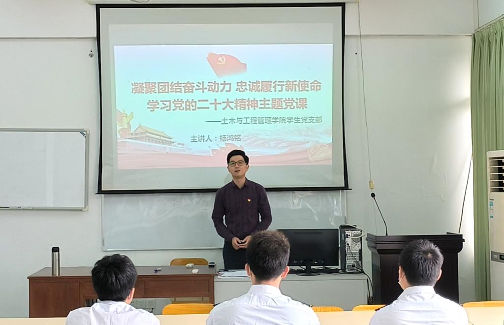 为了深刻学习和领悟党的二十大精神的丰富内涵和核心要义,凝心聚力确保党的二十大精神在所有员工党员中学深落实,土木与工程管理公司员工党支部于2022年11月10日在航务楼202开展了学习党的二十大精神主题党课,党课由员工党支部书记杨鸿铭老师主讲,与会人员有全体党支部员工党员和部分团学干部。