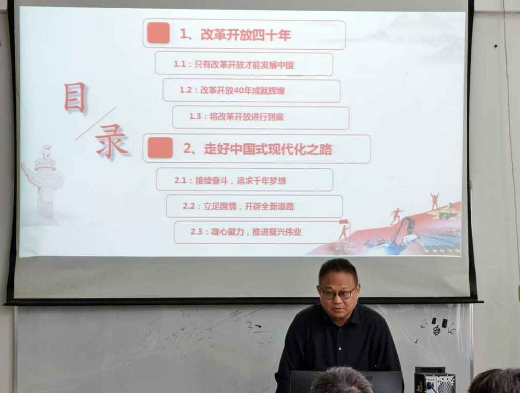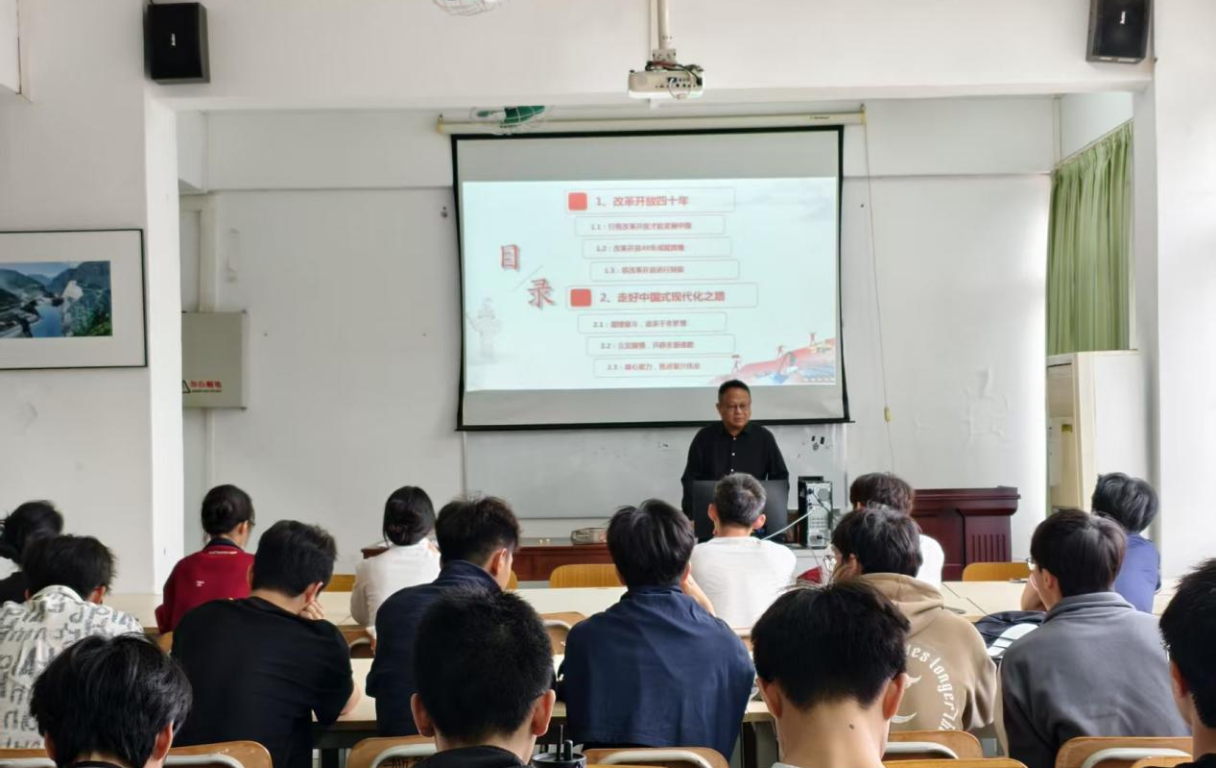 课堂上,刘锋经理以自身的亲身经历,带领同学们回顾了波澜壮阔的改革开放历程,阐述了“只有改革开放才能发展中国”的深刻内涵与历史必然性,通过讲述中华民族接续奋斗、追求千年梦想的历程,重点剖析了中国式现代化立足国情、开辟全新道路的五大特征,阐明了其作为人类文明新形态的世界意义,引导同学们深入思考如何“走好中国式现代化之路”,极大地激发了同学们的民族自豪感,并号召大家继承敢闯敢试的精神,矢志不渝地将改革开放推向前进。最后,他勉励全体同学要凝心聚力,坚定“四个自信”,将专业所学与国家所需紧密结合,在推进民族复兴的伟业中实现青春价值。