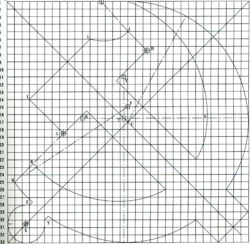 3 镰刀的画法:以M点(17、17′)为圆心、MN(N点为17、1′)为半径画弧⌒NO(O点为17、33′);以P点(17、15′)为圆心、PO为半径画弧,与HG的延长线交于Q点;以R点(1116′、17′中点)为圆心、RN为半径画弧,与通过R点的水平线交于S点;以T点(16、1716′、17′的中点)为圆心、TS为半径画弧,与通过T点的垂直线交于U点;以V点(16、1711′中点)为圆心、VU为半径画弧,与HG的延长线交于W,构成镰刀。以X点(3、430′、31′的中点)为圆心作圆与AB、BC线相切,从Y点(6、30′)、Z点(4、28′)分别作直线平行于BD,构成镰刀把。