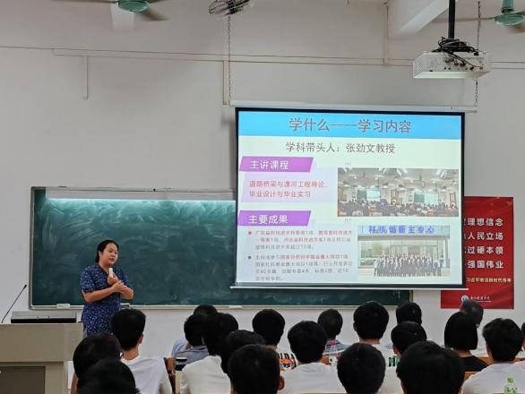杨娥主任为新生详细介绍道路桥梁与渡河工程专业内涵、教学目标和就业前景,并从专业视角对新生提出了殷切期望。杨慧教授等骨干老师为新生分享专业学习、科研、考研、就业等经验,鼓励同学们多交流、多沟通,增强团队合作意识。