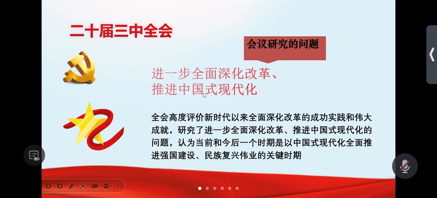随后,邹巧玲书记组织大家集中学习了《中共中央关于进一步全面深化改革、推进中国式现代化的决定》,重点解读了进一步全面深化改革的总目标、2035年目标和七个“聚焦”等内容,播放了相关视频,并激励全体员工党员紧密结合实际,勇于探索创新,努力为实现中华民族伟大复兴而努力奋斗。