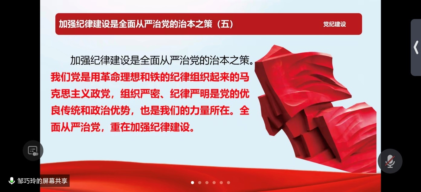 会议开始,员工第二党支部书记邹巧玲带领员工党员们原原本本学习了《习近平关于全面加强党的纪律建设论述摘编》中关于“加强纪律建设是全面从严治党的治本之策”的重要论述,引导员工党员认认真真领悟加强纪律建设对于全面从严治党的重要性,自觉增强纪律意识,加强自我约束。
