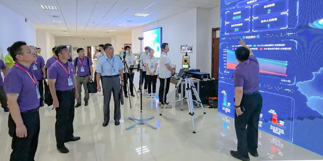 竞赛现场,东北大学车德福教授向与会专家介绍了由南方测绘与东北大学联合开发的大赛展示平台。平台实现了竞赛参与总人数、赛项考生统计、考试与阅卷进度、考生省份分布、院校报名统计及监考画面等核心数据的集中可视化管理,显著提升了赛事的信息化管理水平,为公平、公正、高效的竞赛运行提供了有力保障。