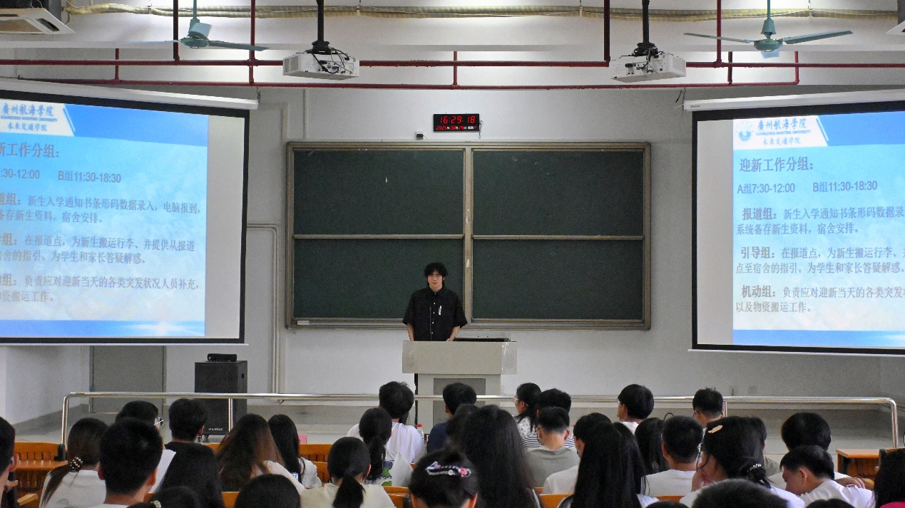 随后,由分团委书记余慧谍发言,她向大家提出几点要求:一是要凝聚思想共识,二是要明确自身职责,三是要严守工作纪律。她指出全体工作人员要通力合作,以热情饱满的精神面貌迎接各位新生及家长的到来。