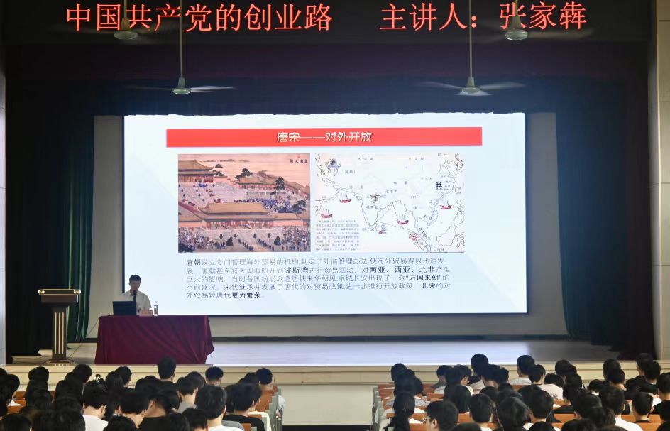 讲座伊始,张家犇员工以“中华民族百年屈辱”为引,通过《时局全图》等历史史料与不平等条约数据,直观展现近代中国的苦难历程,揭示旧中国因封闭守旧而陷入被动的历史教训。紧接着,他以“创业”视角解读党史,将中国共产党的成立喻为“初创团队注册”,借南昌起义等事件,解析早期“团队”的战略调整与危机应对,呈现了中国共产党在艰难环境中破局发展的奋斗图景。并聚焦党的十八大以来的反腐败斗争成果,以详实数据展现全面从严治党的坚定决心,深入解读“一带一路”倡议的全球影响,呈现中国在国际舞台的“创业”新布局。