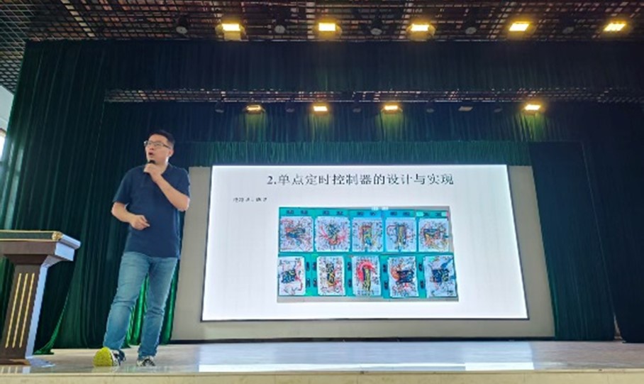 作为本次活动的核心环节,智慧交通负责人朱思聪教授带来了题为“交通信号控制从原理到实践”的专题分享。他从信号相位设计基础知识切入,系统解析了信号周期、相位与周期的关系,以及如何根据交通流量来设计优化的信号相位、相序 、时长,结合城市路口交通相位案例,生动展现了从传统控制到智能优化的技术演进脉络。朱教授特别强调,深入学习单点定时控制器的设计与实现方法,其中C语言作为嵌入式系统开发的核心工具,是实现交通信号实时响应、算法落地的关键支撑,直接影响智能信号机的运行效率与控制精度,呼吁新生夯实编程基础。最后,朱教授介绍了现在广泛使用的区域交通信号优化技术和SCOOT(Split Cycle and Offset Optimization Technique)原理与应用,指出这一阶段的学习将帮助同学们掌握如何综合调度和优化交通信号控制,实现交通流量的最大化利用。