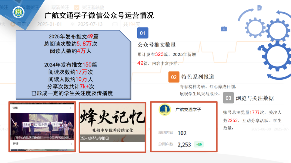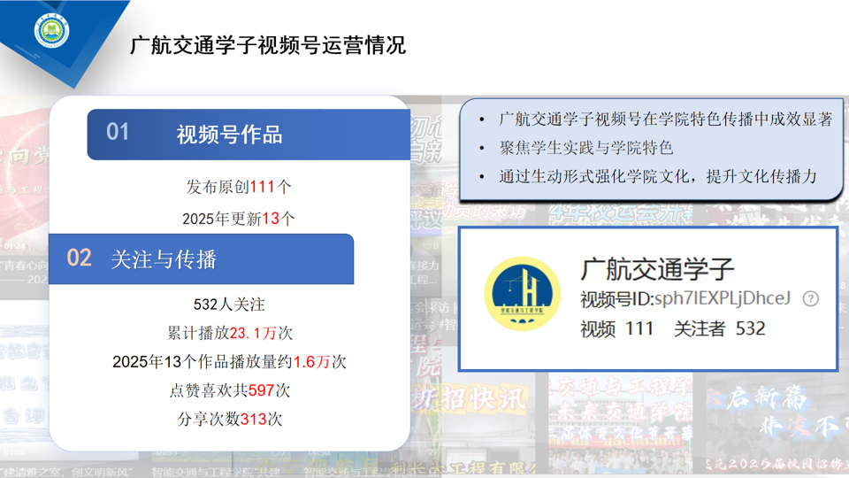 截至目前,各平台关注总人数3490人,公众号累计发布推文323篇,视频号发布原创作品111个,在易班微社区发布内容57篇,共14篇被全国易班网采用,充分彰显了交通公司在平台思政内容的优质性与影响力。