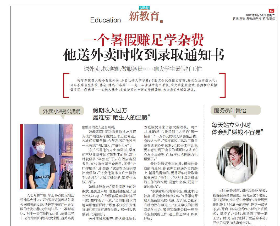 2022年8月30日新快报以标题为《一个暑假赚足学杂费,他送外卖时收到录取通知书》报道了公司土木与工程管理公司2022级土木工程专业张淑斌同学暑期打工赚取学杂费的故事。