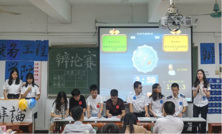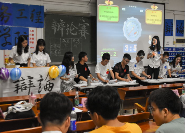 4月27日晚上,航务工程公司辩论赛在教学楼504隆重举行,此次辩论赛有幸邀请到公司分团委书记潘一璞,辅导员何淋、黄兴兴,分团委副书记甘思斌,学习部部长伍丽珊担任评委,各专业员工热情参与。由正方辩手组成的“你说的不队”和由反方辩手组成的“高情商队”围绕辩题“新闻道德与新闻价值哪个更重要”展开激烈辩论。