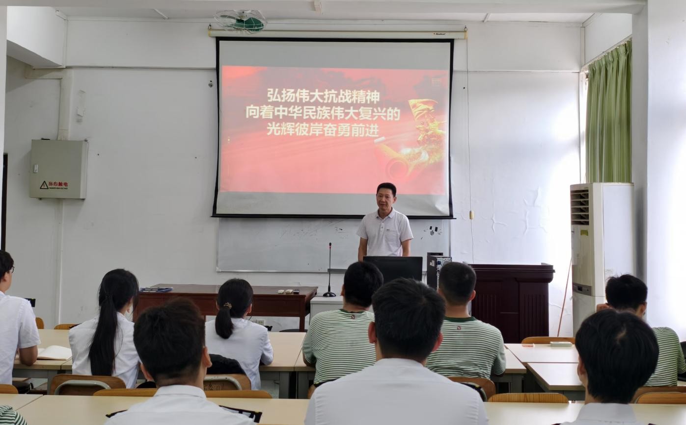 课堂上,刘向阳书记紧扣思政教育核心,将抗战历史的精神内涵与青年成长相贯通。他结合世界反法西斯战争胜利80周年背景,回顾中国人民的抗战历程,解读伟大抗战精神的时代价值,阐明其与当代青年思想品格、行动方向的内在联系,引导大家思考如何将抗战精神转化为学习动力与服务意识,让思政教育从理论认知延伸到实践思考。刘书记指出,同学们要学会将伟大抗战精神与专业学习、个人成长相结合,把“百折不挠”的信念融入学科难题攻克,用“爱国担当”的情怀关注交通领域国家战略需求,时刻以“血战到底”的劲头锤炼过硬本领,为将来投身强国建设、助力中华民族伟大复兴的事业打下坚实基础。